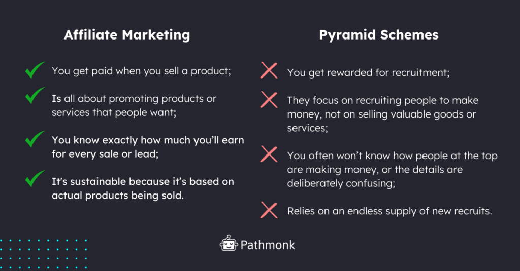 Alright, let’s tackle the most important part of this conversation. While affiliate marketing and pyramid schemes may look similar to someone standing at a distance, they are entirely different beasts. Let’s break down the key differences: